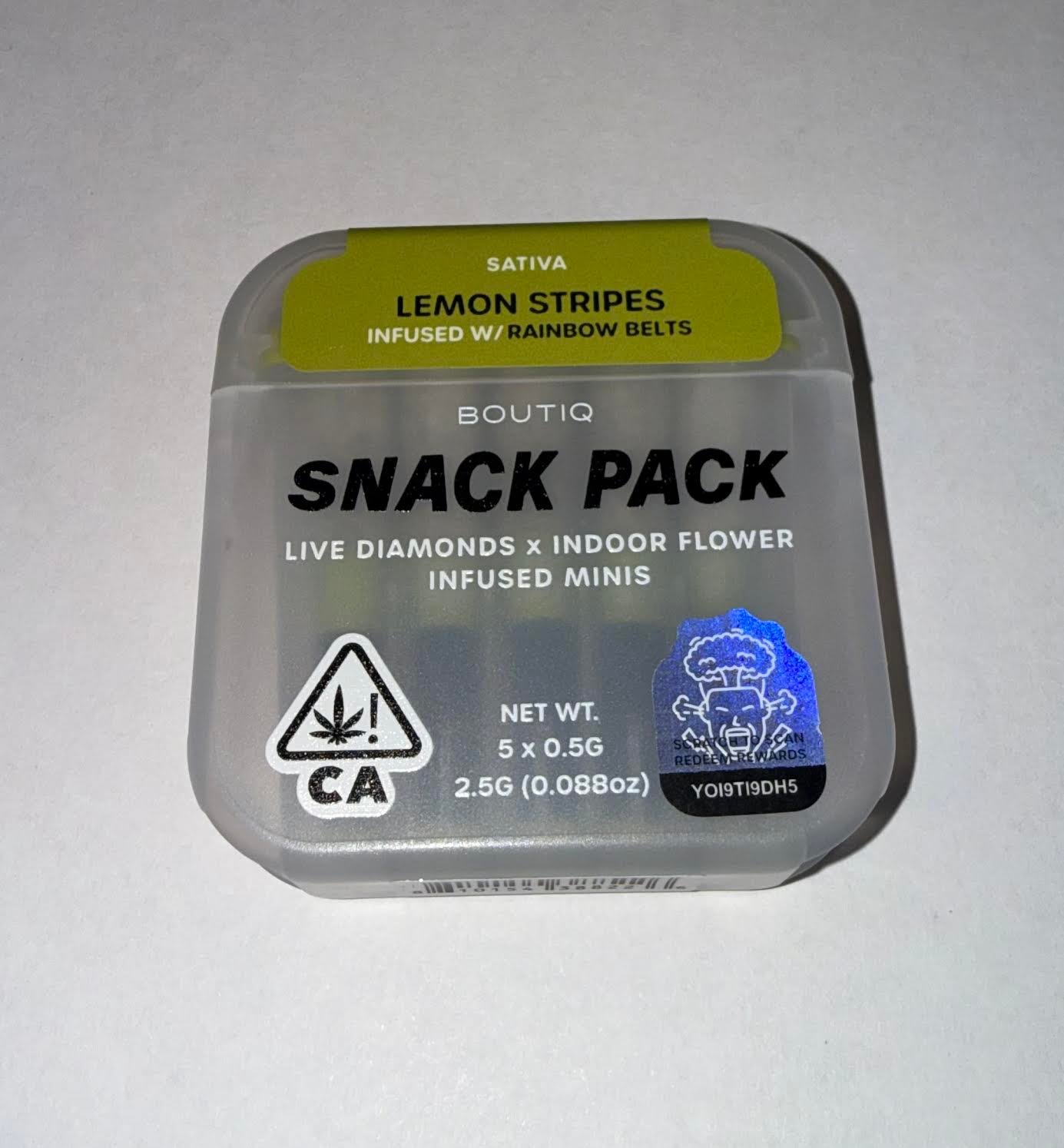 Boutiq 5-Pack Pre-Rolls deliver a total of 2.5 grams split into five expertly rolled pre-rolls made with indoor flower and live diamonds. Designed for flavor and potency, each pre-roll is crafted to burn evenly while enhancing the natural terpene profile of the strain.
